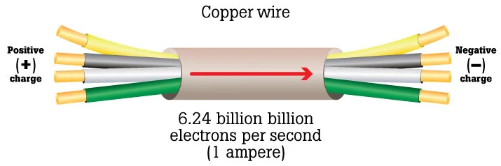 Current is the rate at which electrons flow past a point in a complete electrical circuit. At its most basic, current = flow. An ampere (AM-pir), or amp, is the international unit used for measuring current. It expresses the quantity of electrons (sometimes called "electrical charge") flowing past a point in a circuit over a given time. A current of 1 ampere means that 1 coulomb of electrons—that's 6.24 billion billion (6.24 x 1018) electrons—is moving past a single point in a circuit in 1 second. The calculation is similar to measuring water flow: how many gallons pass a single point in a pipe in 1 minute (gallons per minute, or GPM).